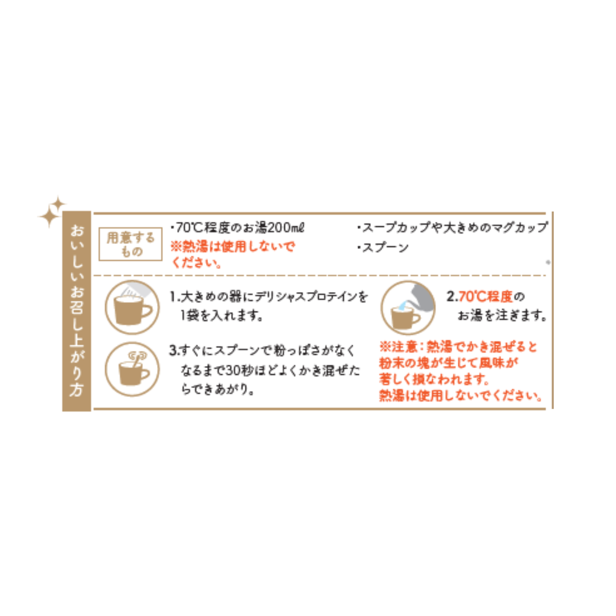 ※注意:熱湯でかき混ぜると粉末の塊が生じて風味が著しく損なわれます。熱湯は使用しないでください。